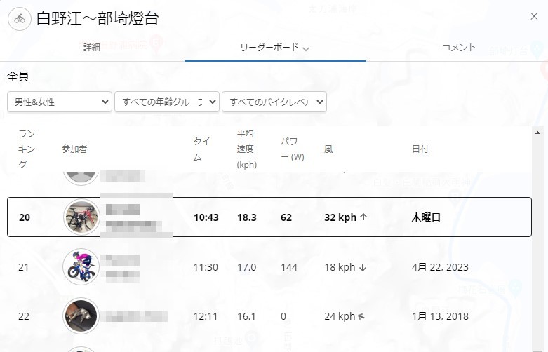 私が走行データは20位、タイム10分43秒、パワー62Wと記録されている。